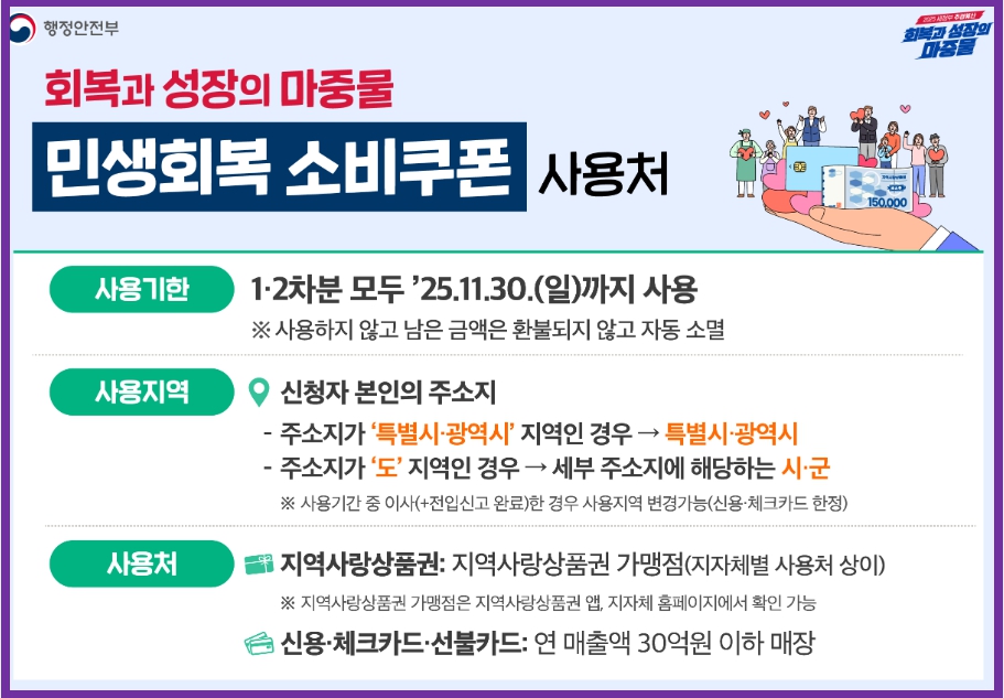 민생회복 소비쿠폰은 단순한 지원금을 넘어, 우리 지역 경제를 살리는 중요한 수단입니다. 다양한 사용처 중 본인에게 맞는 방식을 선택하여 적극적으로 활용해보세요. 앞으로도 정부는 서민경제 안정을 위한 다양한 정책을 지속적으로 추진할 예정입니다.