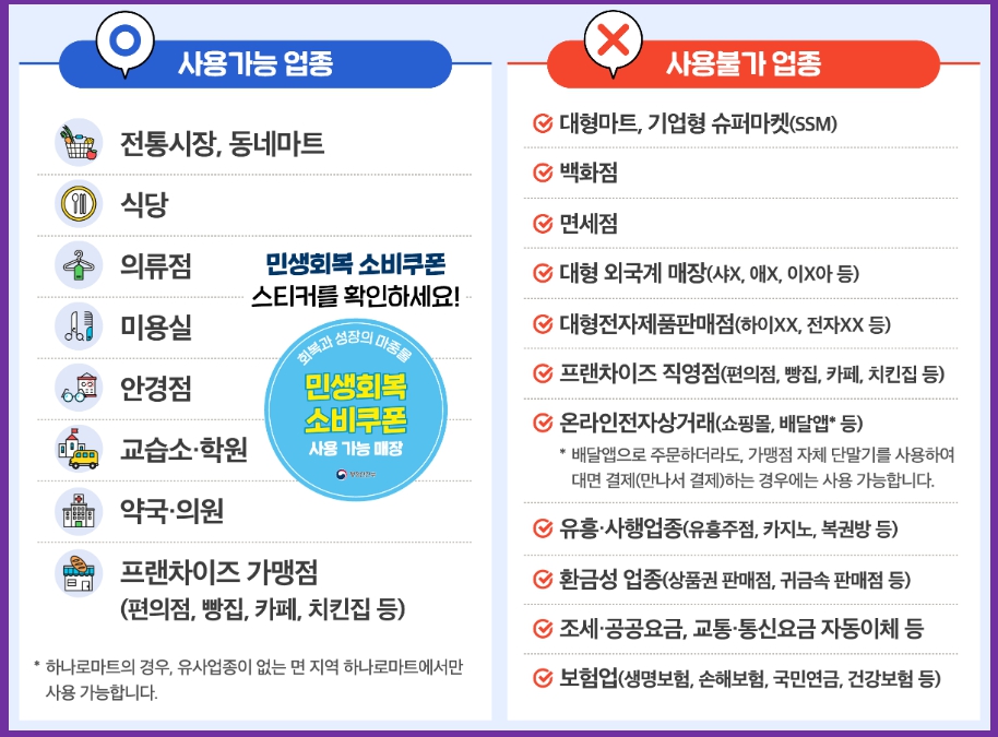 민생회복지원금은 지역 소상공인을 지원하는 목적이기 때문에, 매출 규모와 업종에 따라 사용이 제한될 수 있습니다. 따라서 사용 전 반드시 매장의 소비쿠폰 스티커 확인 및 가맹점 여부를 체크하시기 바랍니다.
