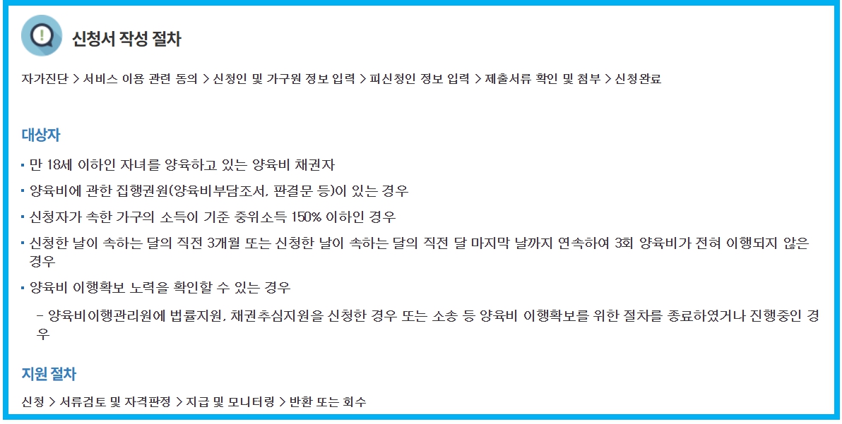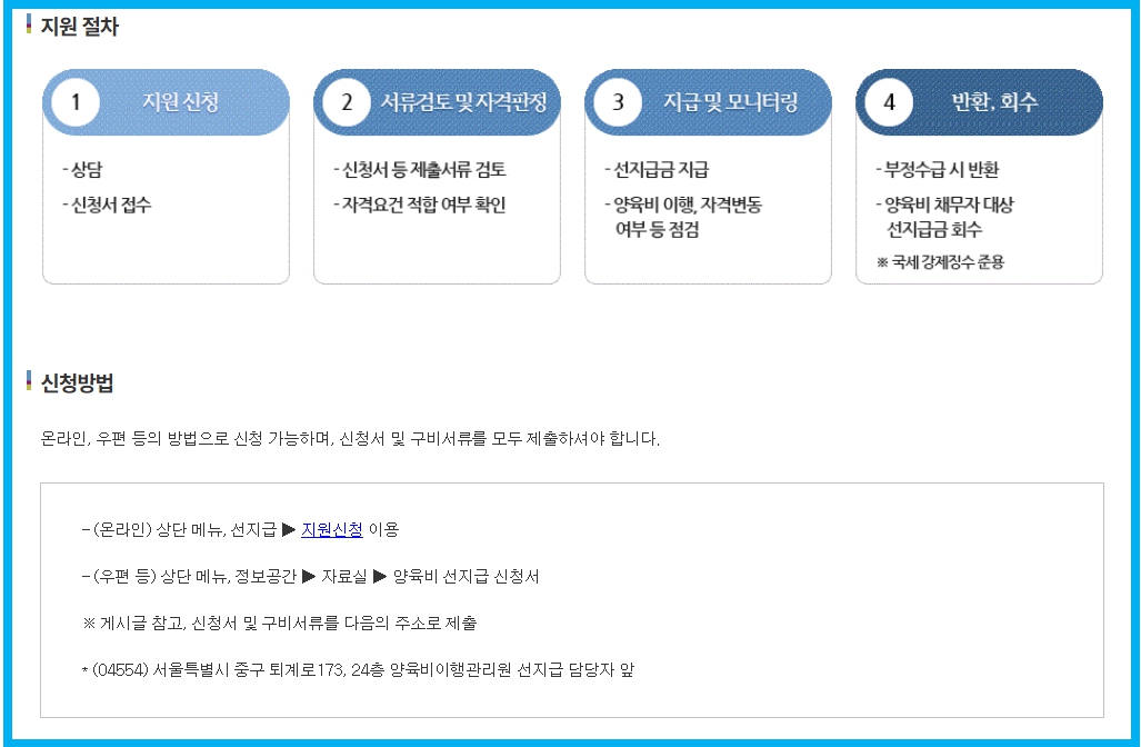 - 온라인 신청: 양육비이행관리원 홈페이지 → 상담 메뉴 → 선지급 → 지원신청